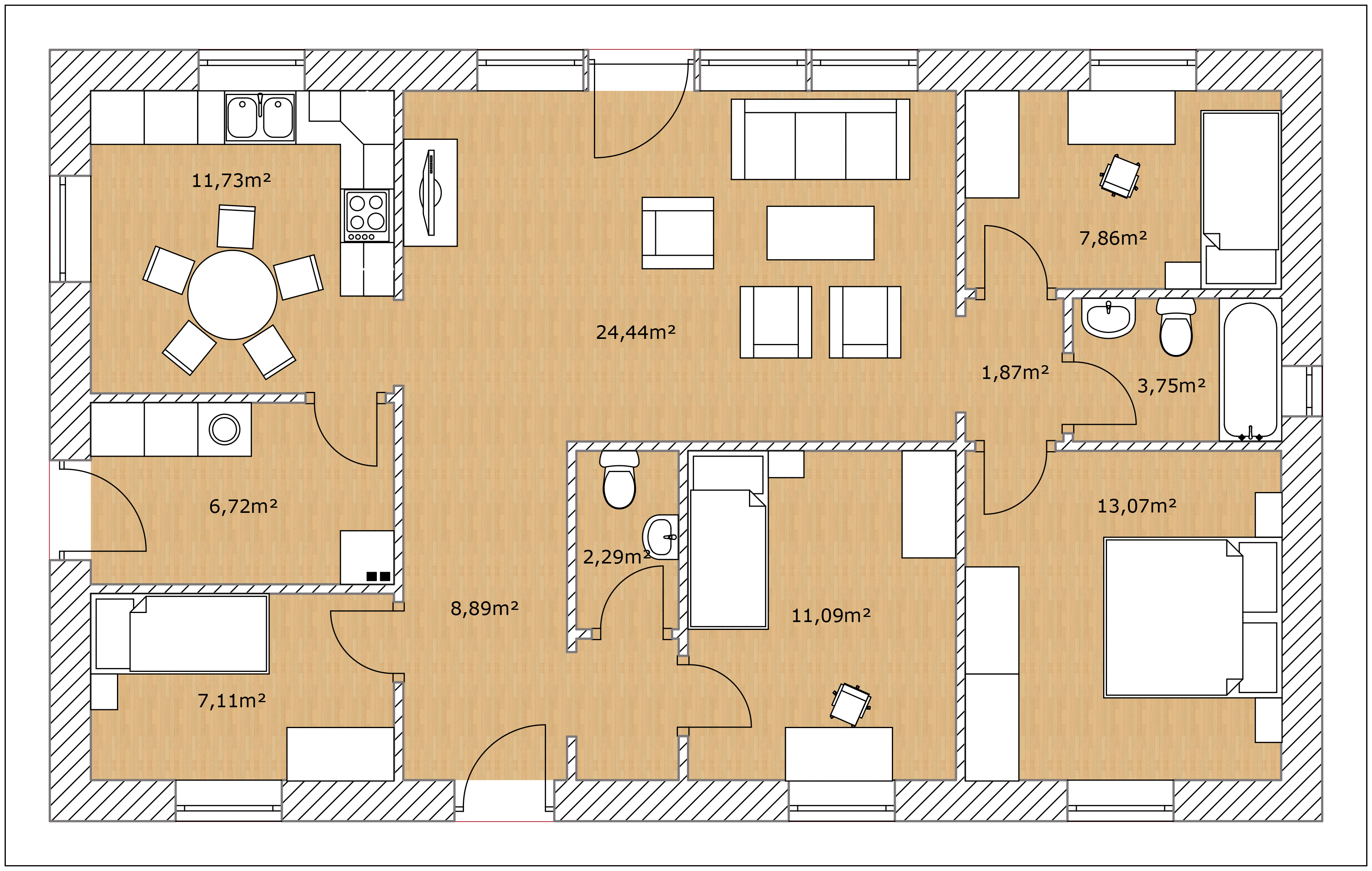 Es ist für kleine Familien, genauso wie auch für die ältere Generation - als Altersruhesitz- konzipiert. Der Grundriss ist problemlos veränderbar und kann so Ihren Bedürfnissen sehr gut angepasst werden. Ob Sie barrierefrei Wohnen möchten oder nur gerne breitere Türen bevorzugen - alles ist realisierbar. Der überdachte Eingang bietet Schutz vor Nässe, um trockenen Fußes ins Haus zu kommen. Auf Wunsch lädt eine breite, überdachte Terrasse zum verweilen ein.