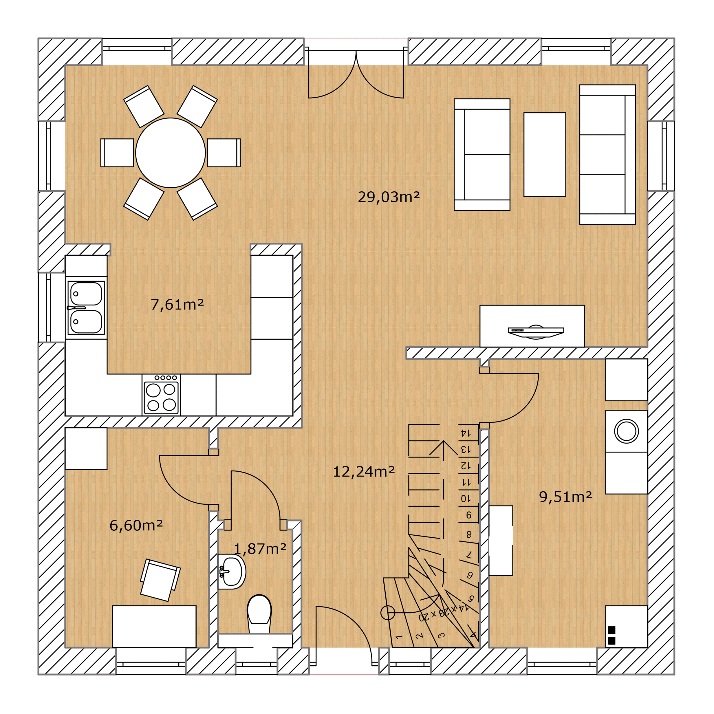 Das war die Maxime bei diesem Grundriss. Denn von den Abmessungen her passt dieses hübsche Schwedenhaus auch auf etwas kleinere Grundstücke z. B. in der Stadt. Das Haus bietet im Erdgeschoss eine offene Küche und einen großzügigen Essplatz zum Wohnzimmer hin. Durch die Terrassentüren gelangen Sie in den Garten. Wie es in Schweden üblich ist, gibt es auch bei der Nordkap Stadtvilla ein Bad mit Badewanne als auch ein Bad mit Dusche.